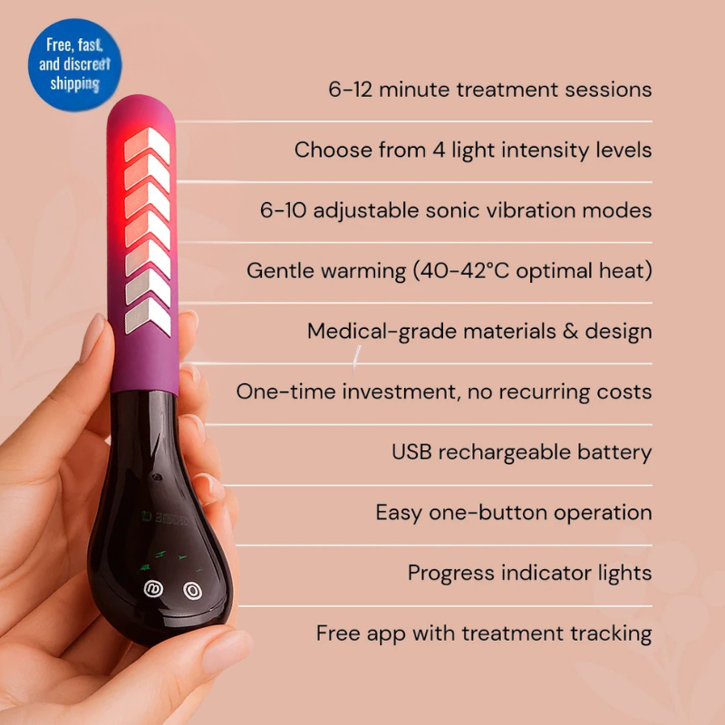Unlike creams that only mask symptoms or HRT that floods your whole system, our device works at the cellular level using three clinically proven technologies: red light that penetrates to rejuvenate tissue, gentle heat that reshapes collagen, and sonic vibration that enhances absorption. That's why 91% of women see results, even after trying everything else. This is the same technology used in expensive medical clinics (£3,000+ per treatment), now available for home use.